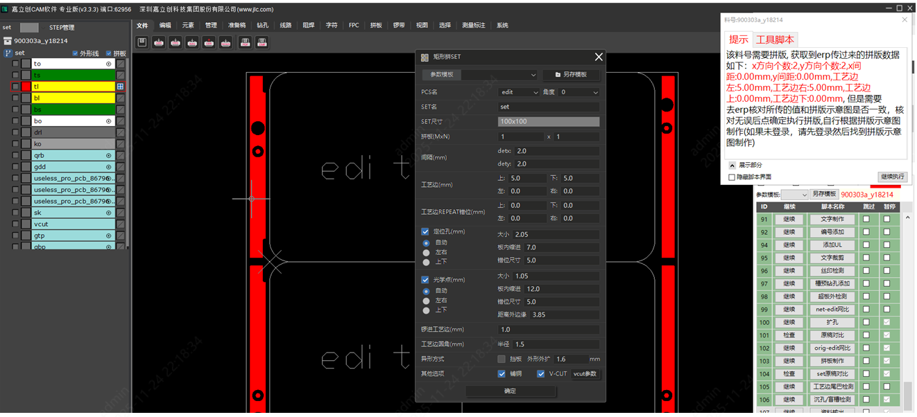 第一阶段 过渡阶段 ,因系统限制:ERP 暂未更新自动补齐工艺边拼版参数,6163银河 CAM 需先获取 ERP 备注的拼版信息,拼板界面相关参数需人工填写 如图2