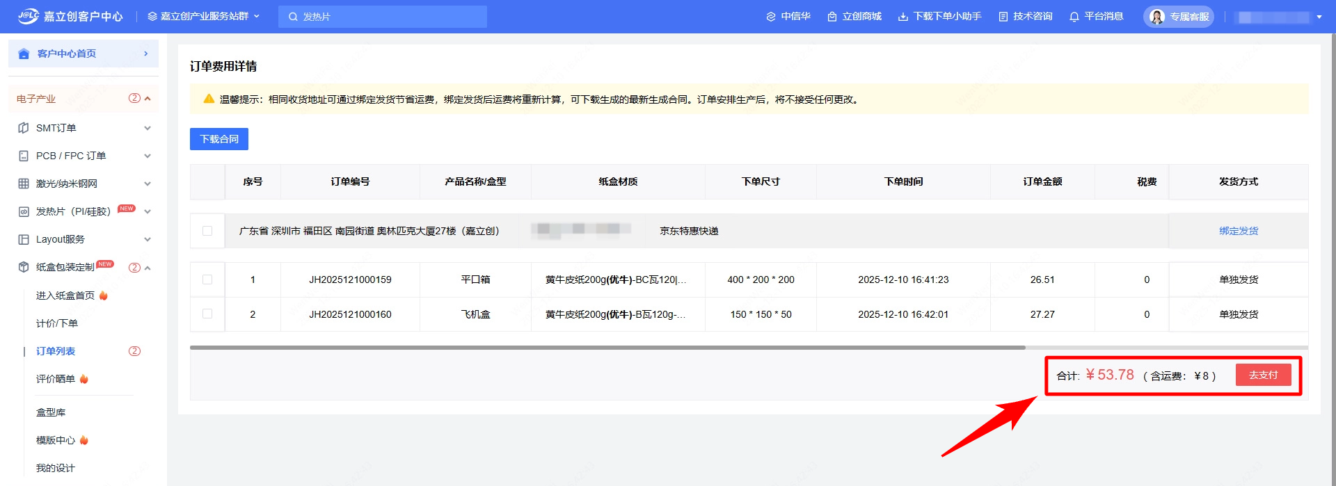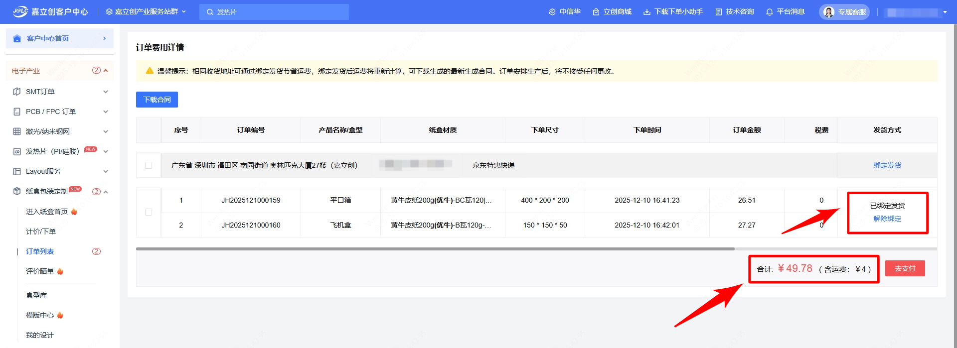 4、免费打样/免费领样的纸盒订单不支持合并支付和绑定发货;