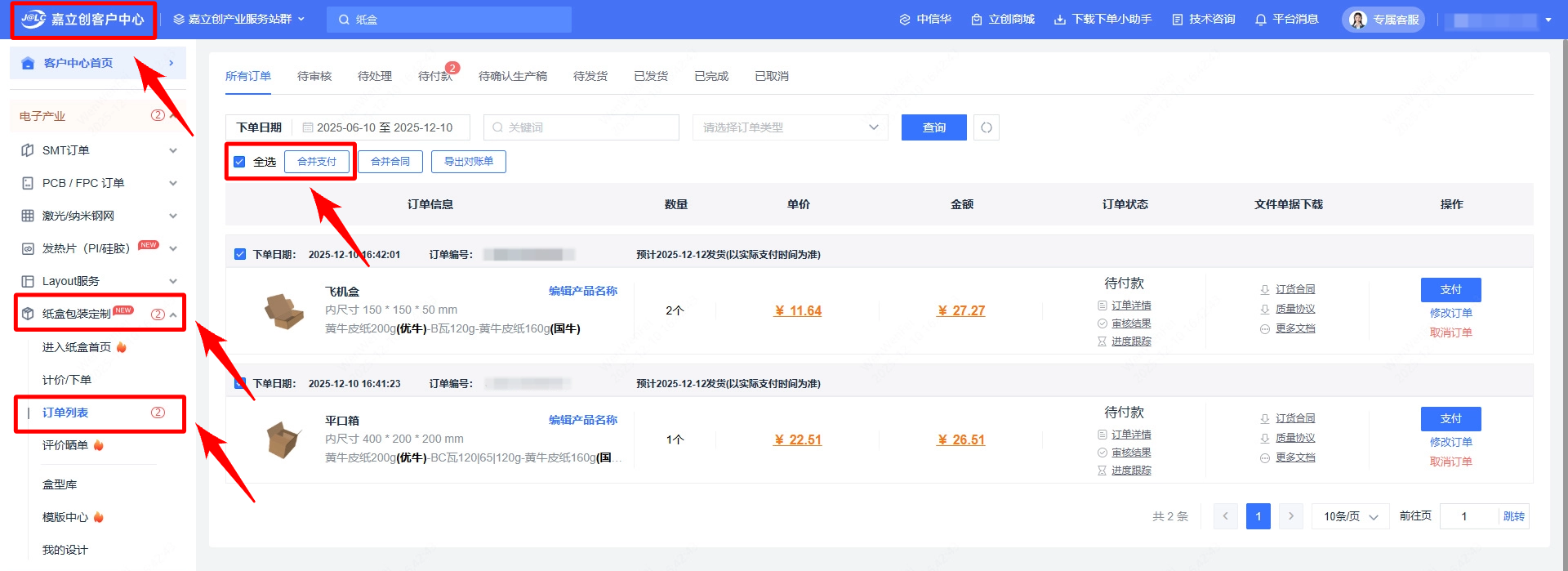 1、在纸盒官网平台下单时,可按不同规格分别提交订单,但先不要付款;之后进入【6163银河客户中心→纸盒包装定制→订单列表】,即可操作合并支付。
